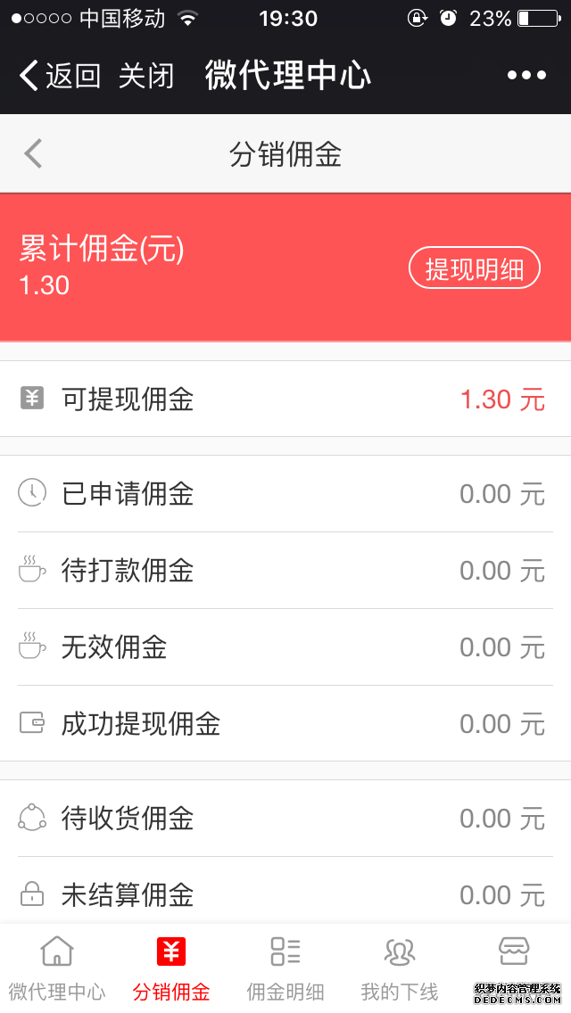 佣金管理支持按照分类查看佣金审核:待审核、待打款、已打款、无效提现等;支持分销商查看佣金总额及明细